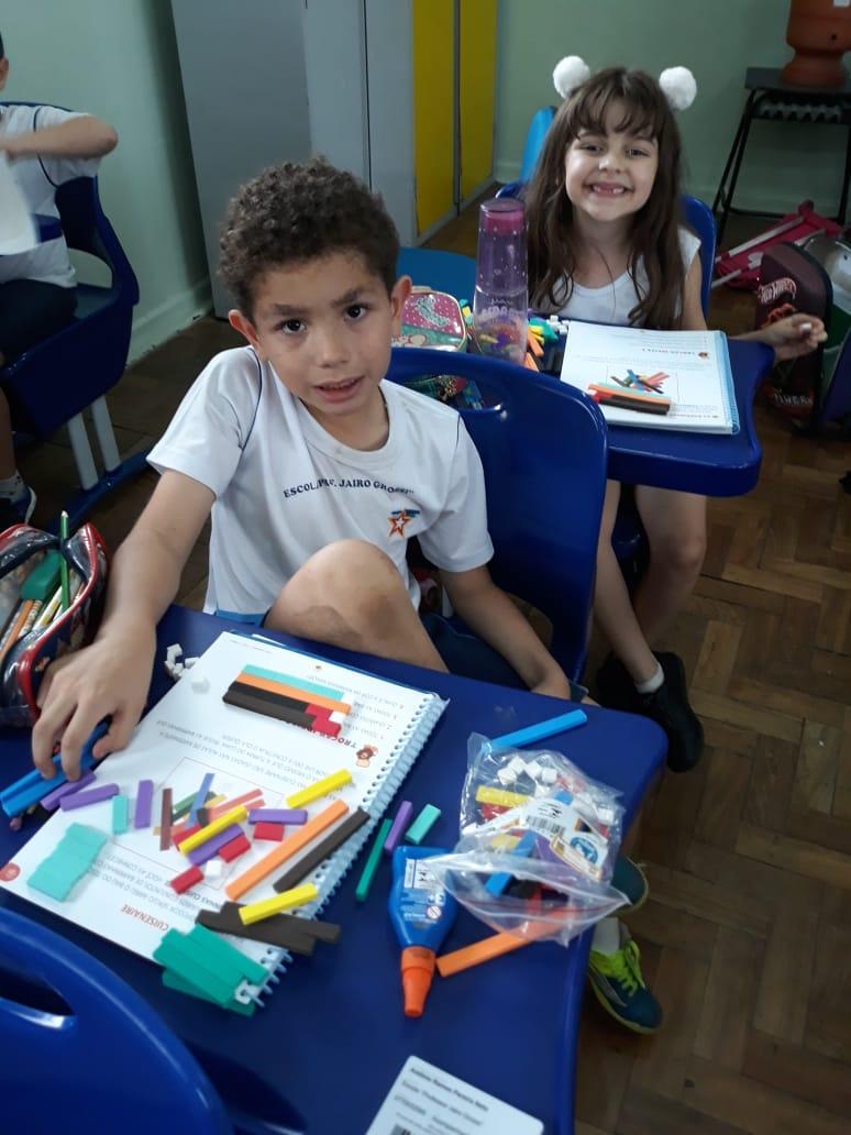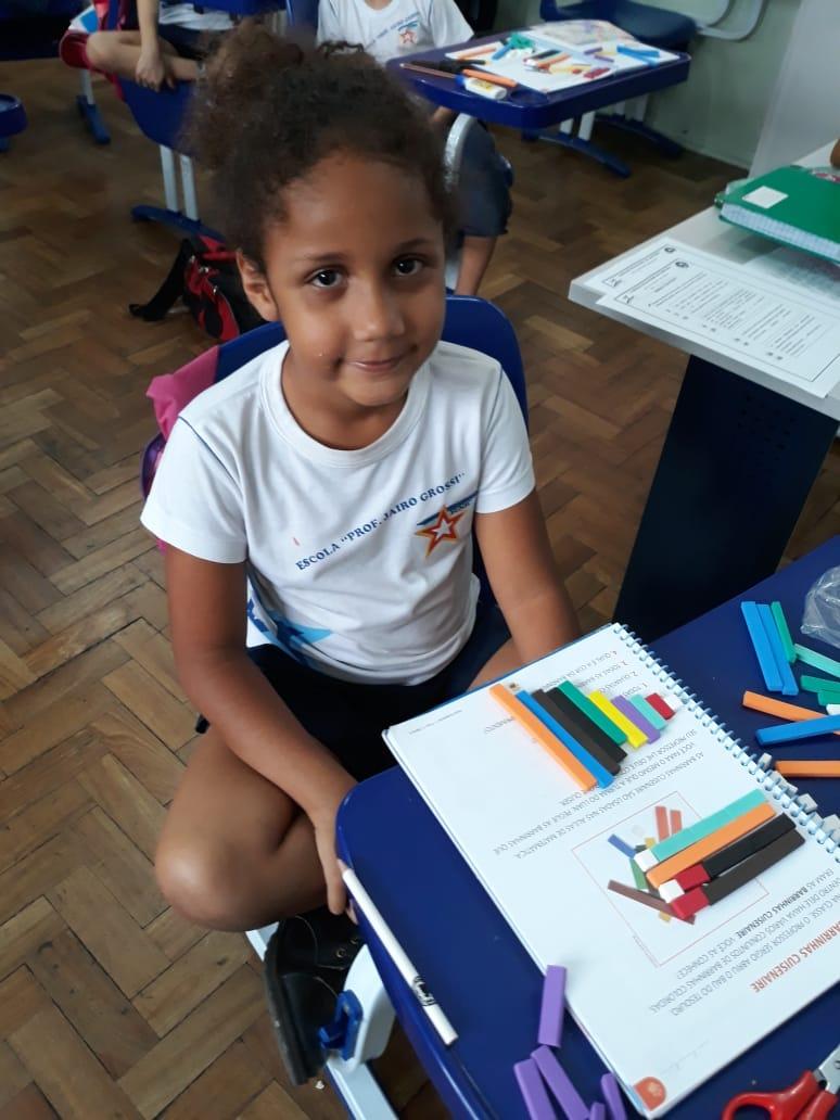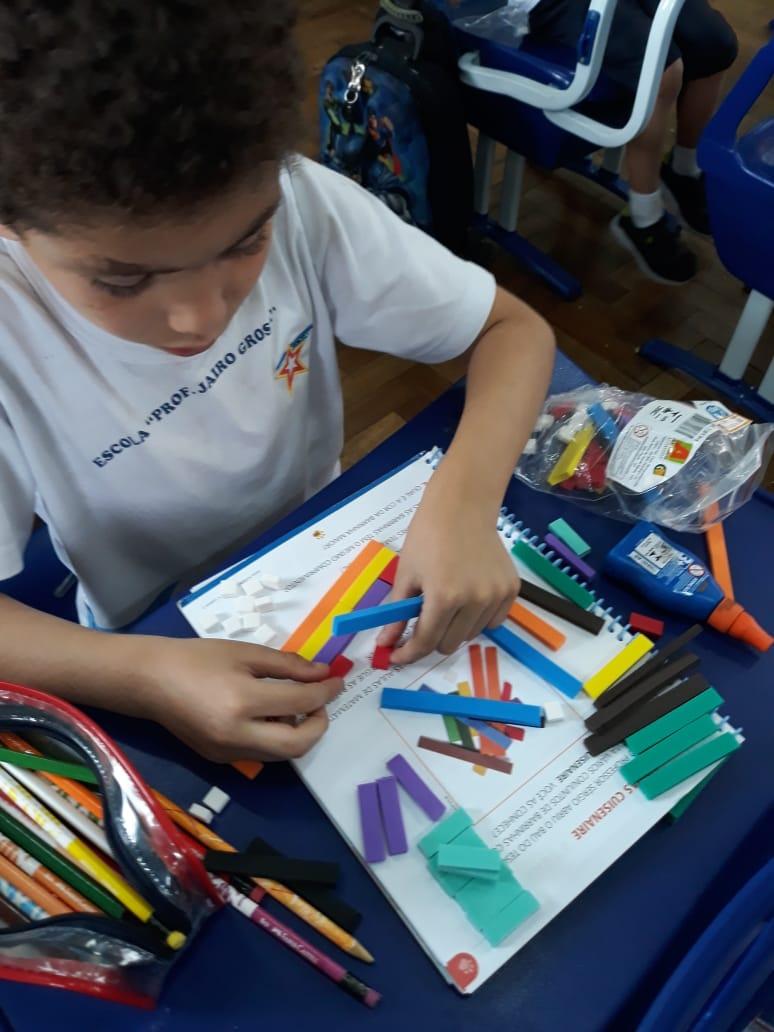 Trabalhando quantidade e explorando composição e decomposição de números, os alunos do 1º ano, orientados pela professora Suelaine, se divertiram com as “Barras Cuisenaire”. Materiais manipulativos constituídos por uma série de Barras de madeira, sem divisão em unidades e com tamanhos variando de uma até dez unidades, onde cada tamanho corresponde a uma cor específica.