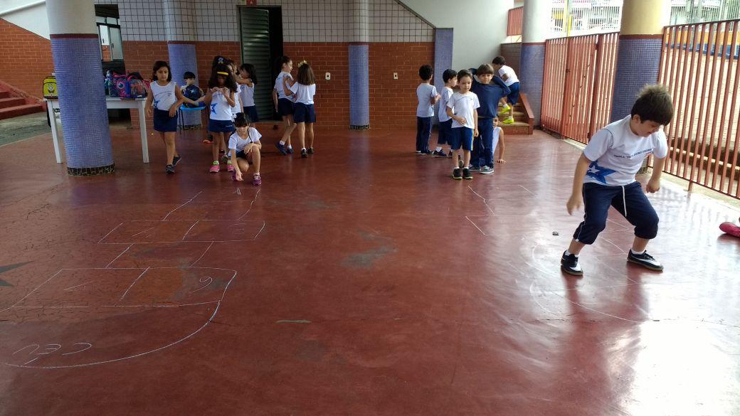Continuando o trabalho sobre formas geométricas, as professoras Andréa Vieira dos Santos, Olinda Borges Moreira Teixeira, Geralda Maria Gomes Rodrigues e Ligia Cristina Rodrigues Dias Martins, levaram os alunos para explorarem as formas geométricas nas brincadeiras, tendo por objetivo Identificar formas geométricas em alguns traçados para brincadeiras. E para esta atividade, contaram com a participação da professora Fernanda Suely Schittini Gardoni que convidou os alunos para se divertirem em algumas brincadeiras: o jogo de amarelinha, bolinha de gude e pular corda.