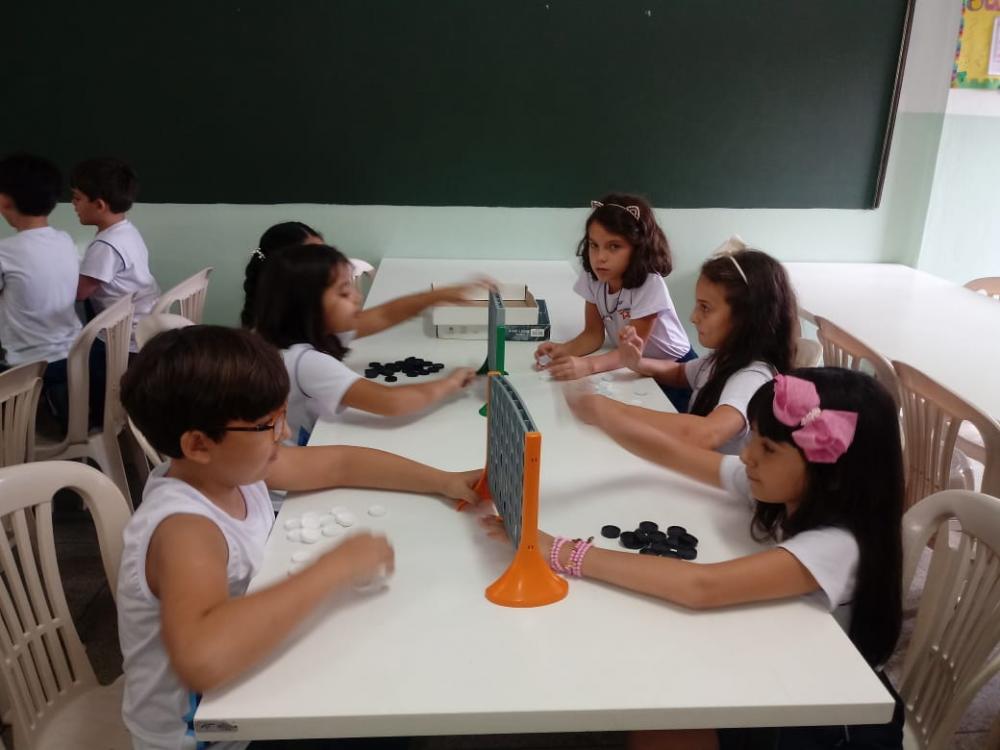 Com este objetivo, os alunos do 4º ano, acompanhados e orientados pela professora Jaqueline, tiveram a oportunidade de conhecer o jogo: “Connect Four ou quatro por quatro”, que consiste em ir colocando as fichas, até que o jogador consiga colocar 4 fichas em linha (podendo ser na horizontal ou na vertical), e impedir que o adversário consiga o mesmo.