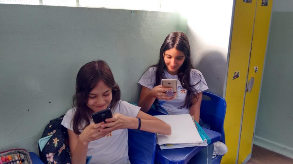 As turmas do 6° ano usaram o celular, na aula de Português, com a professora Marineusa, como um dos veículos de comunicação virtual mais utilizados na atualidade.