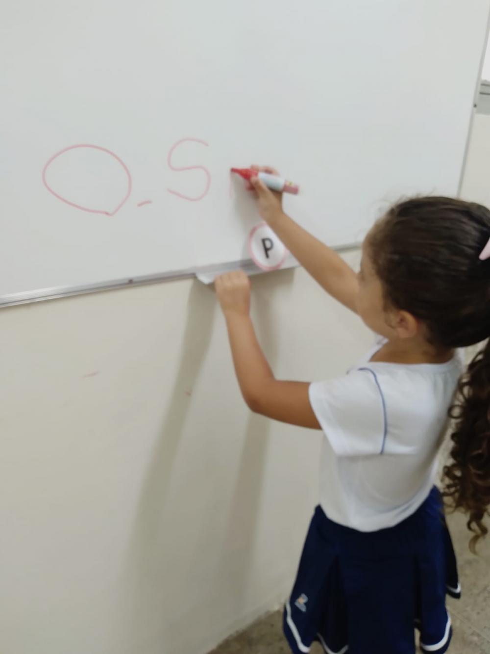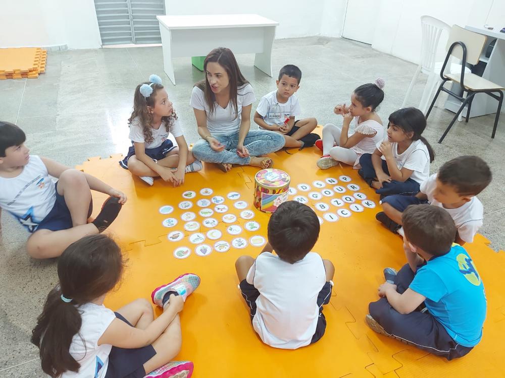 O jogo "Lata do Alfabeto" foi utilizado para ensinar a associação das letras do alfabeto com o nome de cada figura apresentada e seus os diferentes sons. Após a diversão, fizeram o registro da letra escolhida, no quadro.