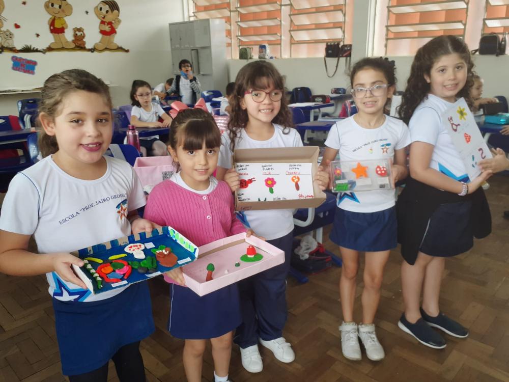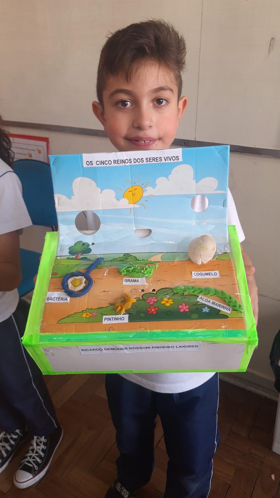Para representarem, de forma criativa e divertida, os cinco reinos dos seres vivos, as professoras Olinda e Andrea, com seus alunos do 2º ano do Ensino Fundamental I, utilizaram massa de modelar e caixas de papelão ou de sapato, identificando, por nome, cada ser vivo e seu reino.