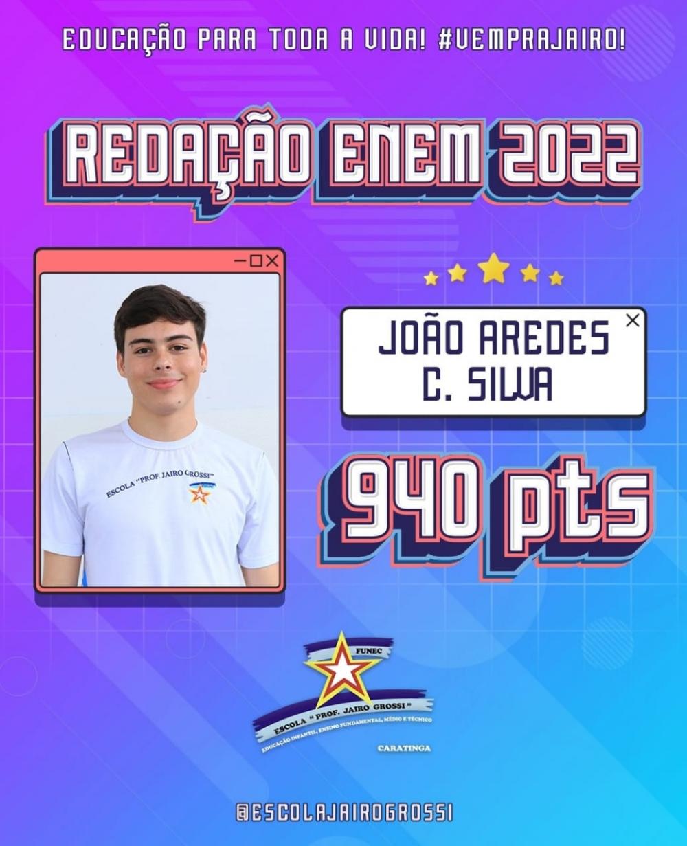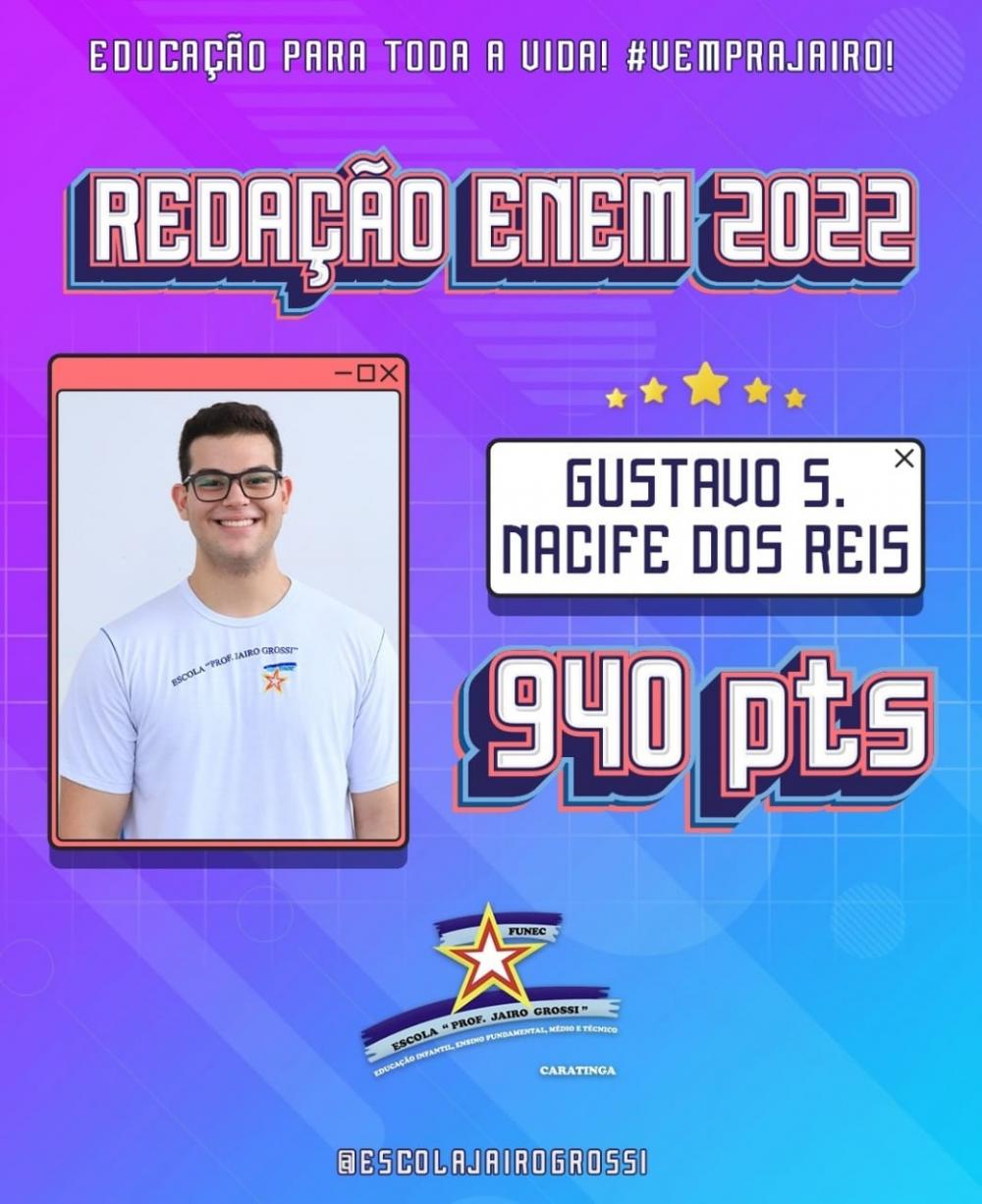 Os alunos do 3º ano do Ensino Médio, do ano de 2022, da Escola “Professor Jairo Grossi”, aproveitaram as chances, se empenharam ao máximo e buscaram apoio dos familiares e, principalmente dos professores sempre que precisaram. Neste momento, que será eternizado na vida de cada um, colocam em destaque e compartilham conosco os resultados de suas conquistas no ENEM.