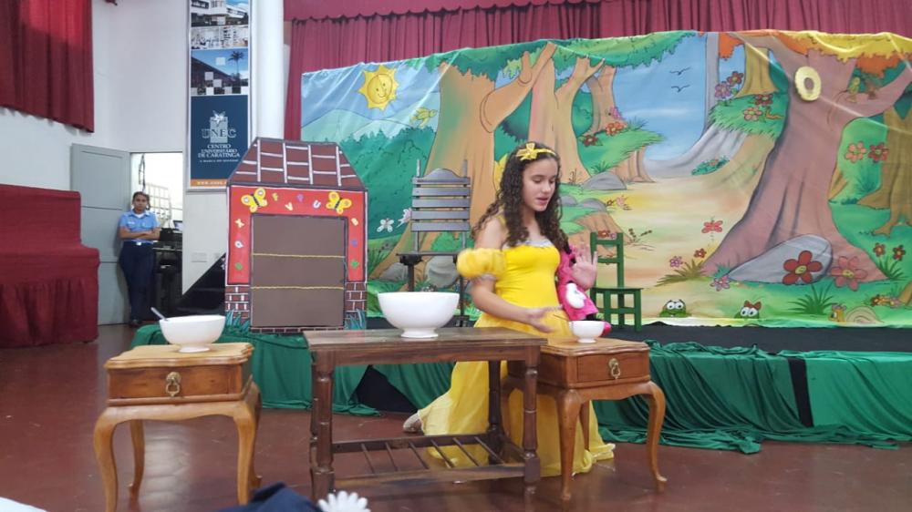 Pensando nisso, os alunos do 6º ano – Fund. I, apresentaram a peça teatral “Cachinhos Dourados e os Três ursos”, sob orientação da professora Eliza Christina, para os alunos da Ed. Infantil.