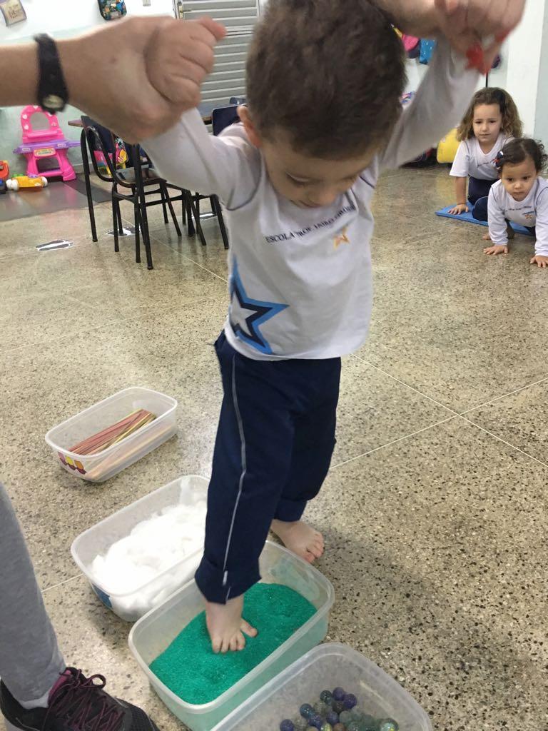 Com os pezinhos descalços, os alunos do minimaternal foram convidados a caminhar por um caminho diferente, experimentando diferentes texturas. As crianças percorreram o caminho, composto por diversos elementos como água, algodão, gelatina, botões, bolinhas de gude, canudinhos... Tendo por objetivo sentir as texturas dos elementos e diferentes sensações através deles.