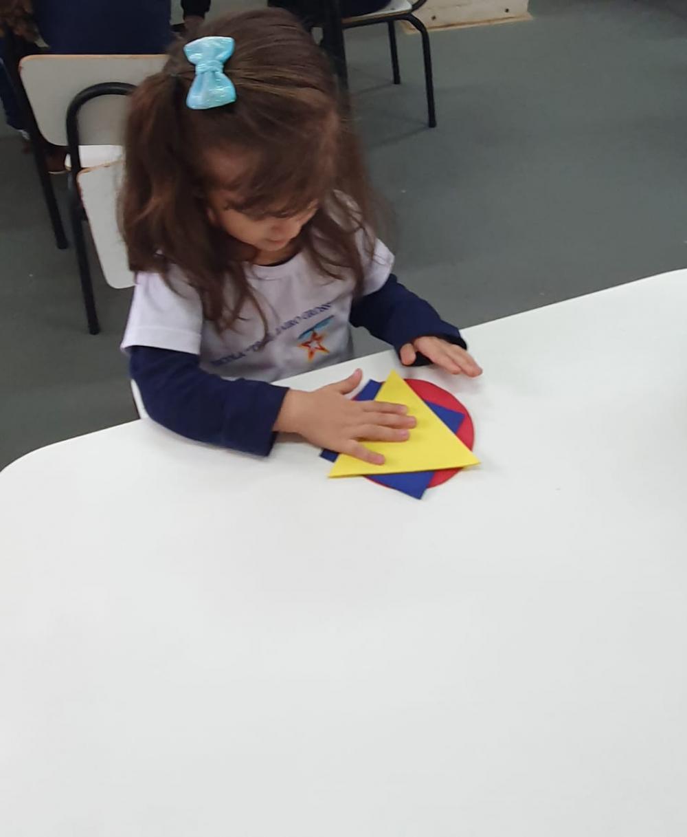 Ao associar e reproduzir um padrão, nesse dia, com as figuras geométricas, a professora do Minimaternal, Cristianni, possibilitou um momento onde pode-se trabalhar a percepção de contrastes, de figura-fundo, da parte em relação ao todo, das distâncias e do posicionamento; noções de sentido e direção e a descrição dos detalhes de cada figura paralela.