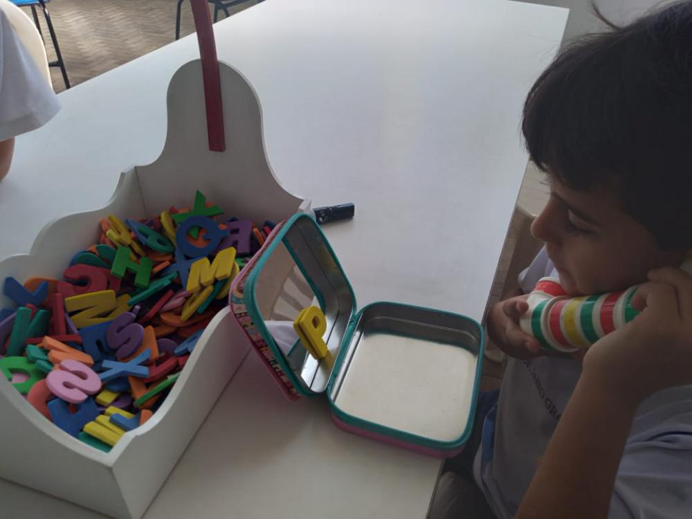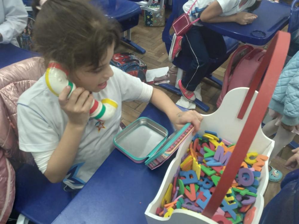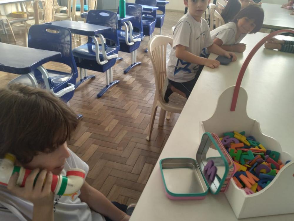 Os alunos das turmas do 2º ano, do Ensino Fundamental I, com a professora Jaqueline Garcia, desenvolveram atividades onde a importância da consciência fonológica foi trabalhada, utilizando os recursos do “sussurrofone”, alfabeto móvel e um espelho para visualização do movimento que a boquinha faz ao pronunciar o som de cada uma das letras.