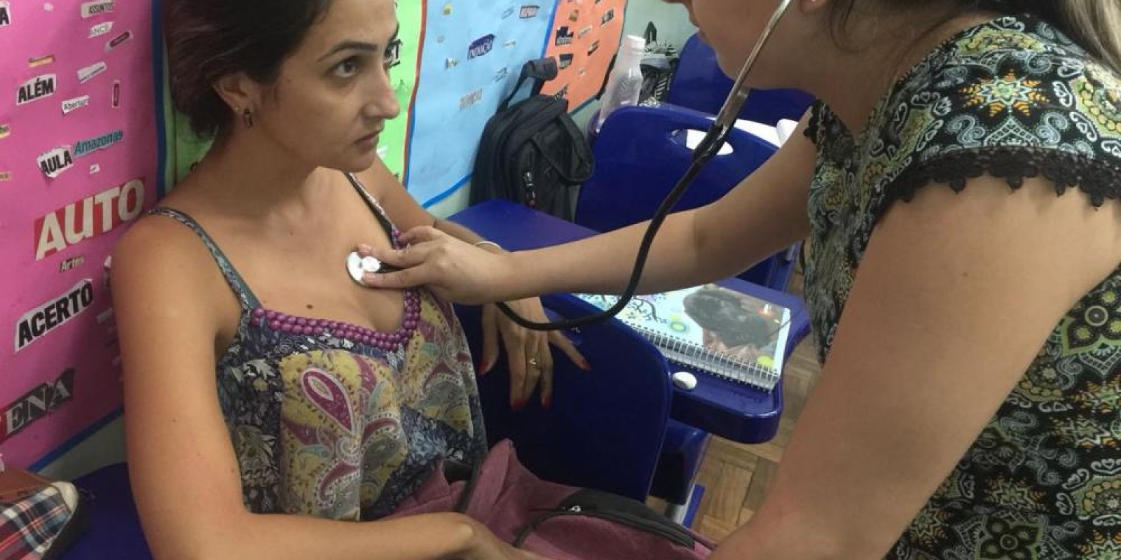Com a orientação da professora Jacqueline Arruda, os alunos do 1º período de enfermagem utilizaram o estetoscópio para fazerem a...